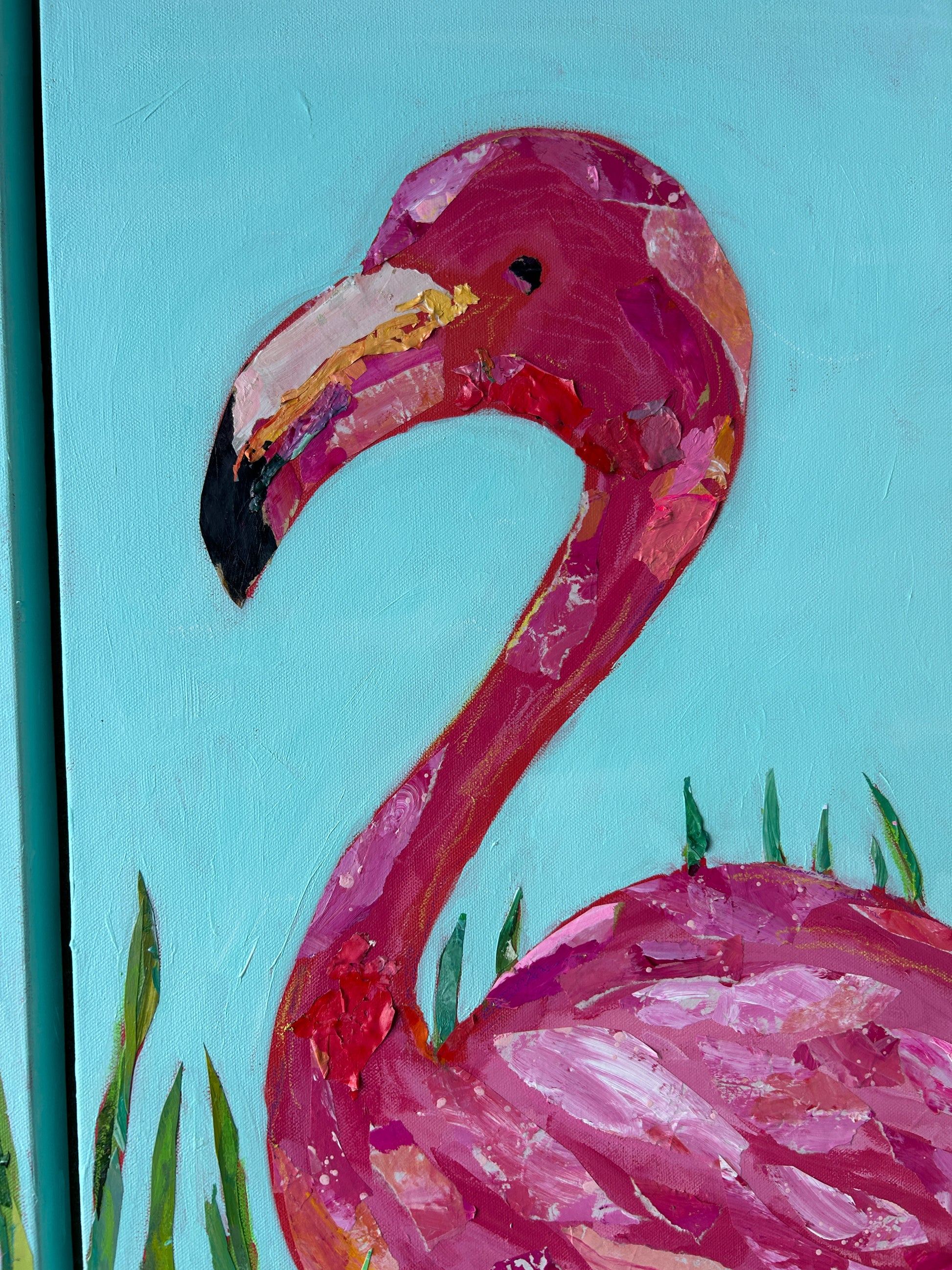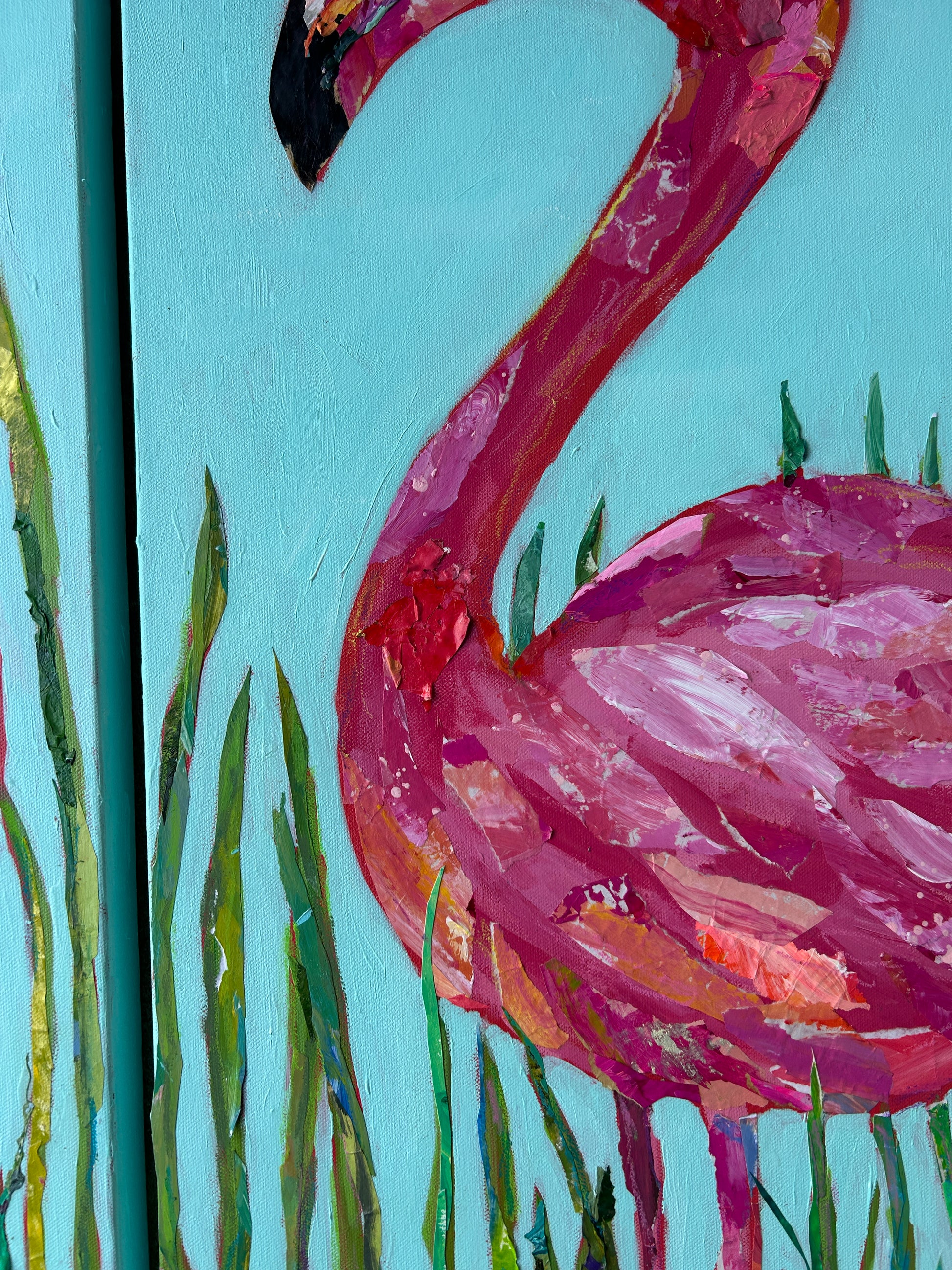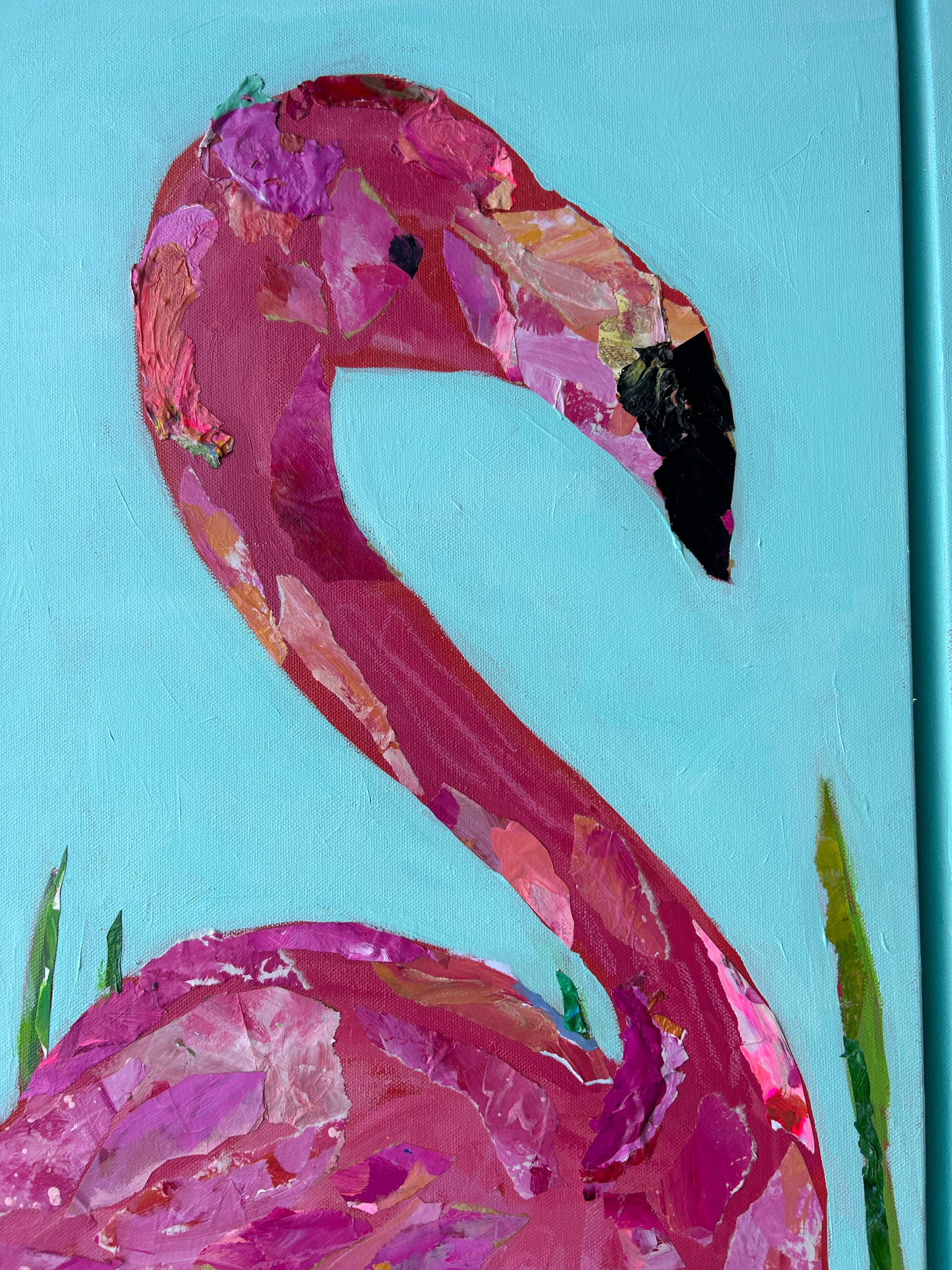 Wade With Me is the newest piece in my Everyday Birds collection, and I’m so excited to share it with you! This bold and bright diptych brings a pair of flamingos to life in my signature collage style, using layers of painted paper, dried paint, and repurposed scraps — a reminder that even the messy, overlooked pieces can become something beautiful. Vibrant pinks, corals, and golds pop against a calm aqua sky, giving the piece movement and energy. Wade With Me is about walking through life together — side by side, even when things get a little muddy.