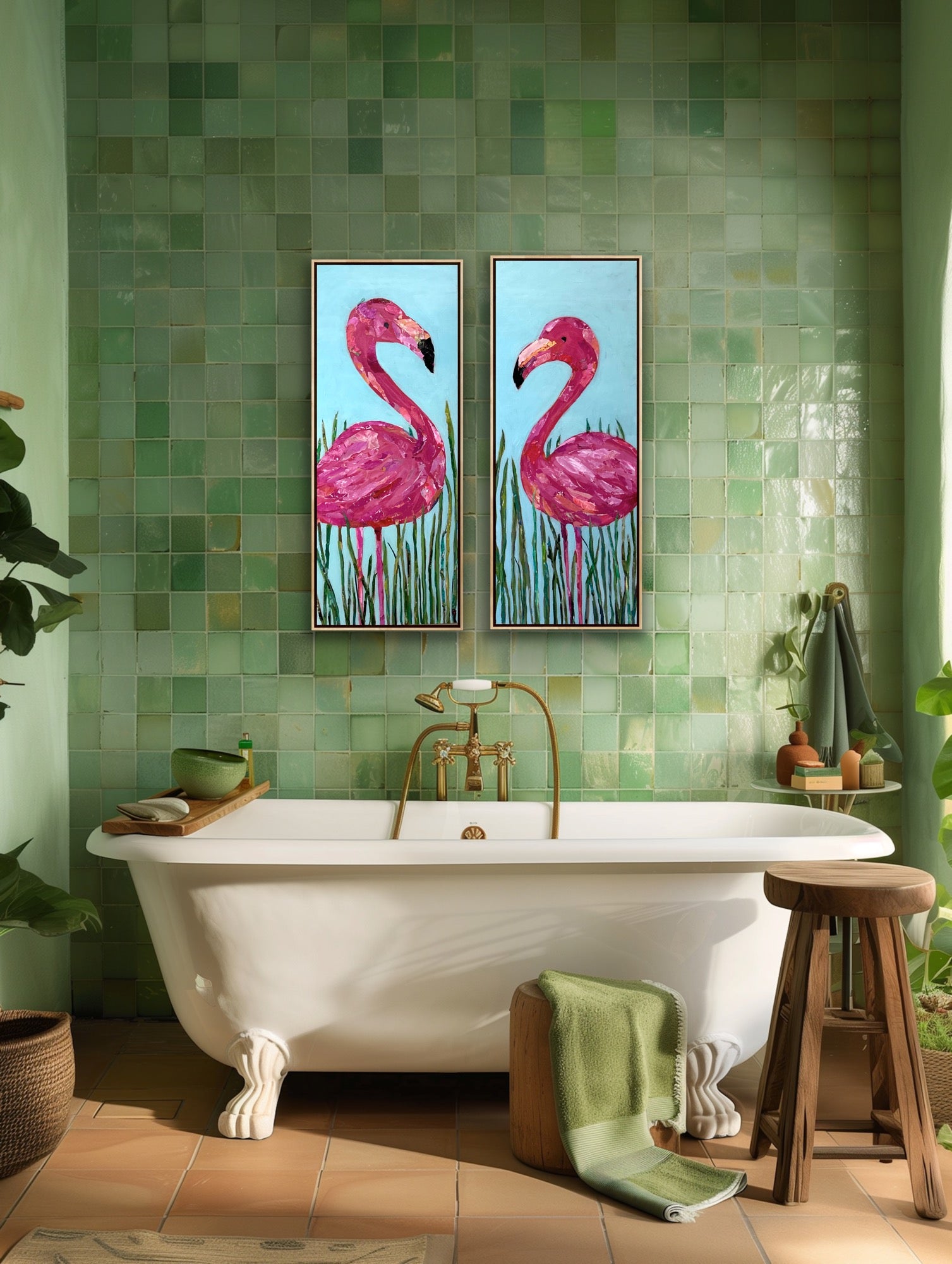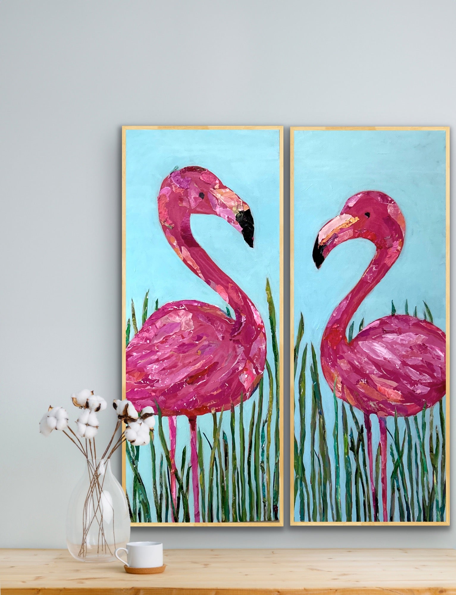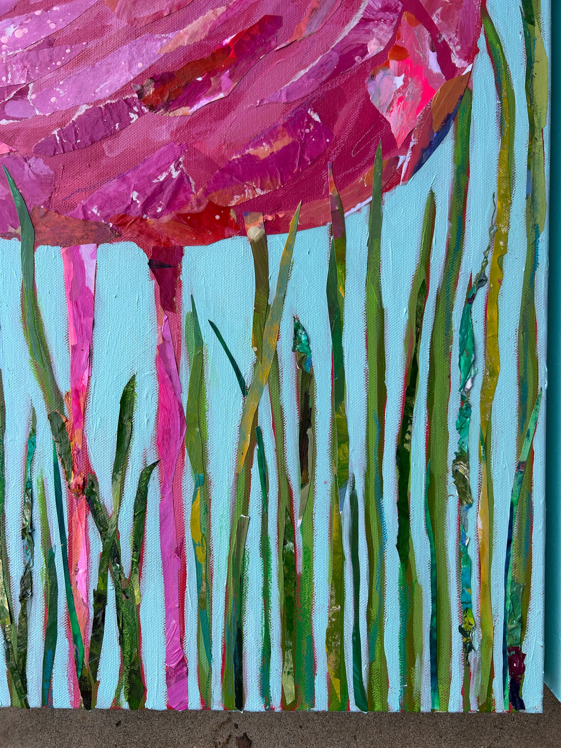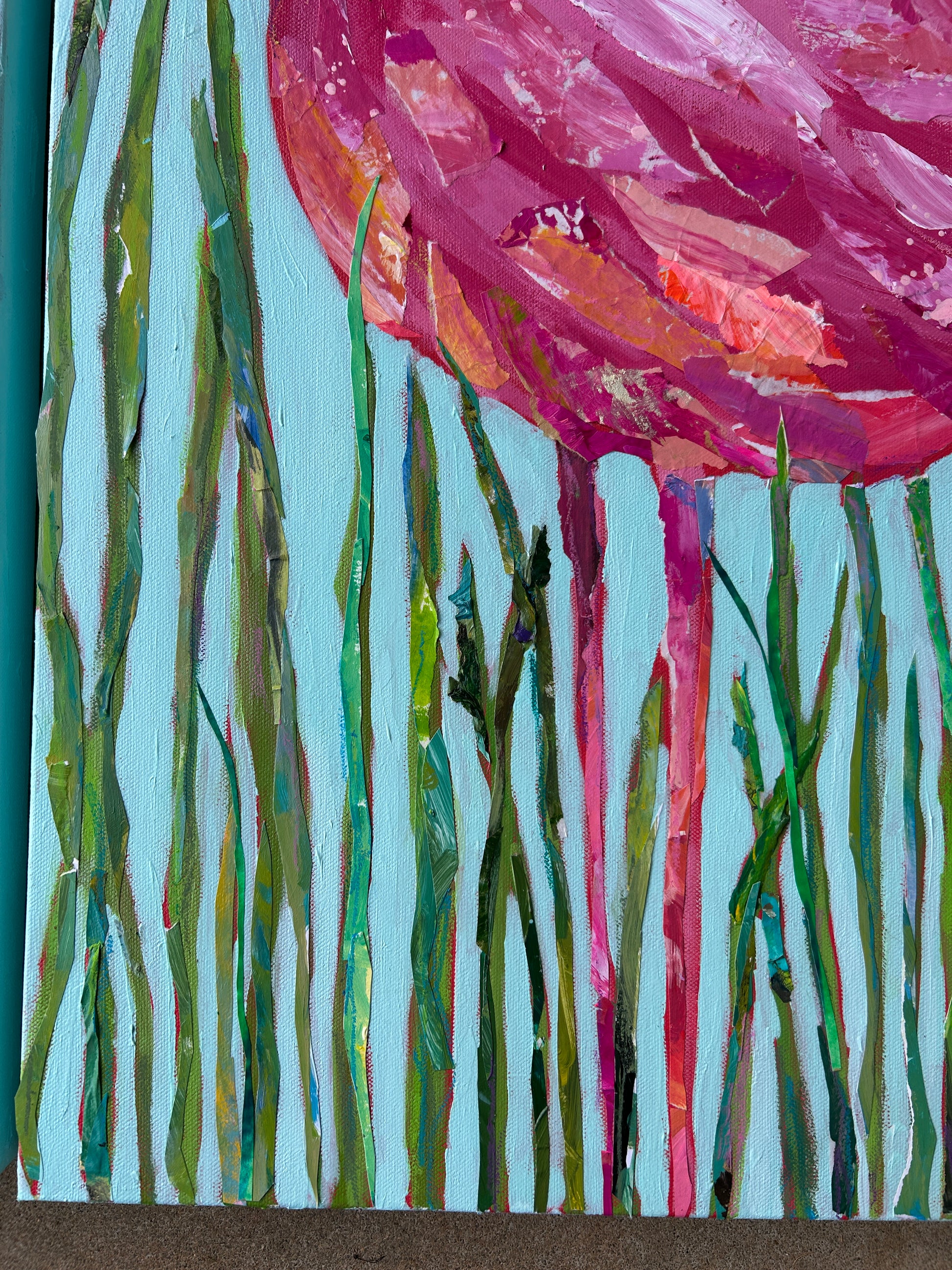 Wade With Me is the newest piece in my Everyday Birds collection, and I’m so excited to share it with you! This bold and bright diptych brings a pair of flamingos to life in my signature collage style, using layers of painted paper, dried paint, and repurposed scraps — a reminder that even the messy, overlooked pieces can become something beautiful. Vibrant pinks, corals, and golds pop against a calm aqua sky, giving the piece movement and energy. Wade With Me is about walking through life together — side by side, even when things get a little muddy.